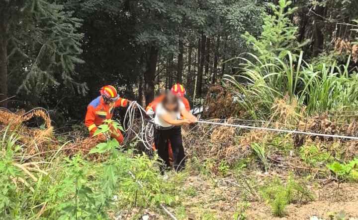 消防救援人员到达现场后,利用绳索和消防车制作固定锚点,携带救援器材装备,前往坡底进行救援,顺着绳索,人工蹚出一条简易救援路线。