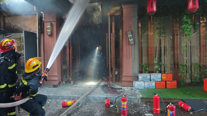 17时28分,消防救援人员到场发现,茶具城一沿街陶瓷店铺厨房部位起火,正在猛烈燃烧,产生大量浓烟,火势向店铺销售区域蔓延,无人员被困。消防救援人员立即对现场进行警戒疏散围观人群,设置水枪阵地,利用排烟机快速排放店铺内浓烟,组织灭火组内攻灭火。19时16分,火灾被扑灭。