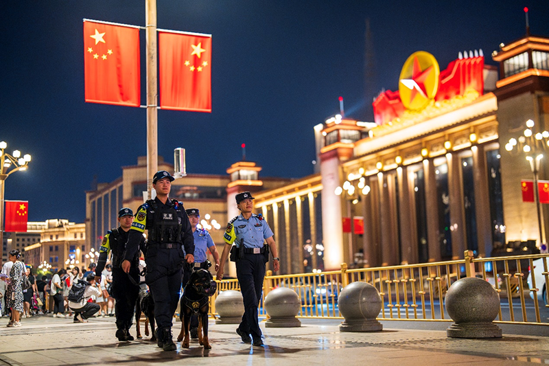 在南昌市八一广场,特警队员开展车巡、步巡、驻点巡,对周边制高点、人流密集区实施立体防控。9月30日晚,彻夜等候升旗的市民游客聚集广场,南昌市公安局女子巡逻队穿梭其间,及时回应求助,提醒看管财物,成为深夜里一道温柔而坚定的风景线。