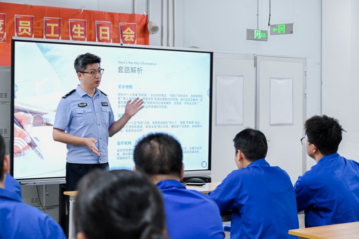 园区警务室把反诈课堂搬进车间、食堂,将诈骗套路编成顺口溜,在食堂、宿舍楼张贴醒目的反诈海报,内容全是真实案例改编的警示故事,让大家看得懂、记得牢。据统计,今年以来,园区电诈案件下降30.95%,数万名员工成了“反诈明白人”。