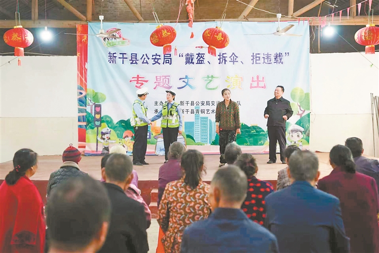 “电动车儿骑得快,头盔必须戴起来!”“违法载人风险高,一旦出事不得了”……近日,在新干县大洋洲镇、沂江乡的乡村戏台上,一场场别开生面的“交通安全大戏”正在上演。台下座无虚席,掌声和笑声此起彼伏。