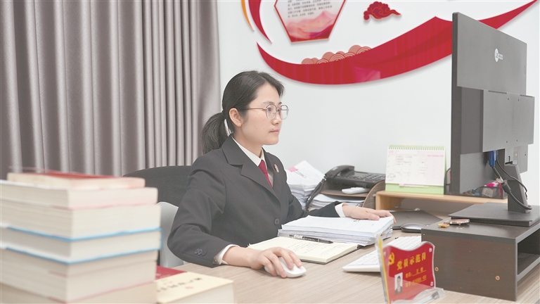 走进旭日法庭,王婧正与企业代表通过电话沟通案件,言谈间沉稳从容,透着一股让人安心的力量。