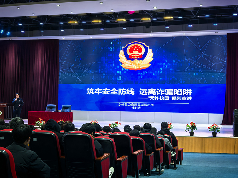 随着寒假的来临,假期安全教育列入学校保卫处的工作日程中。在元旦假期的最后一天,学校保卫处联合永修县公安局艾城派出所精心打造的“大学生的安全”主题宣讲暨“无诈校园”系列活动,在学术报告厅与学校师生如约见面。“你觉得自己会被骗吗?”一开场,驻校民警抛出的问题,瞬间抓住了师生的注意力。一场宣讲下来,学生对反诈工作又多了几分理解。