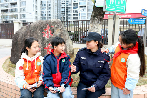 ▲民警向学生们发放宣传资料