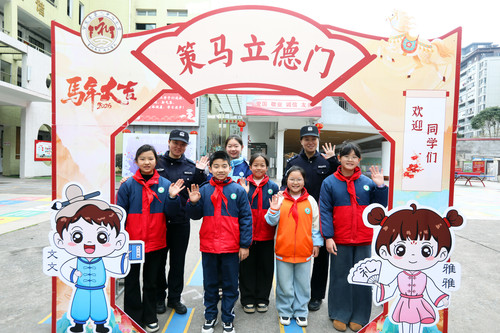 ▲民警在分宜县第二中心小学与学生们迎接新学期到来