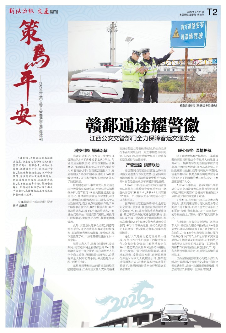 3月12日,为期40天的春运圆满落幕。全省公安交管部门民(辅)警坚守岗位、履职尽责,以科技为引领,搭建共享平台、优化通行管控,高效破解拥堵难题;以严管为保障,聚焦高风险交通违法行为,织密道路安全防线;以温情为底色,完善便民服务举措、帮助受困群众,用忠诚与担当守护万千群众平安出行,在赣鄱大地上书写春运护航的暖心篇章。