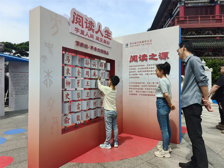 “为什么‘齐’字的甲骨文是三颗星星?”“为什么‘周’字的甲骨文像一块稻田?”在展区中心的“阅读人生”板块,“百家姓·甲骨文翻翻乐”赢得了不少孩子的喜爱。他们一边翻动着字块,一边好奇地向父母发问。家长们带着孩子踱步在展区内,在趣味互动中感受阅读的快乐,理解《条例》的内涵。